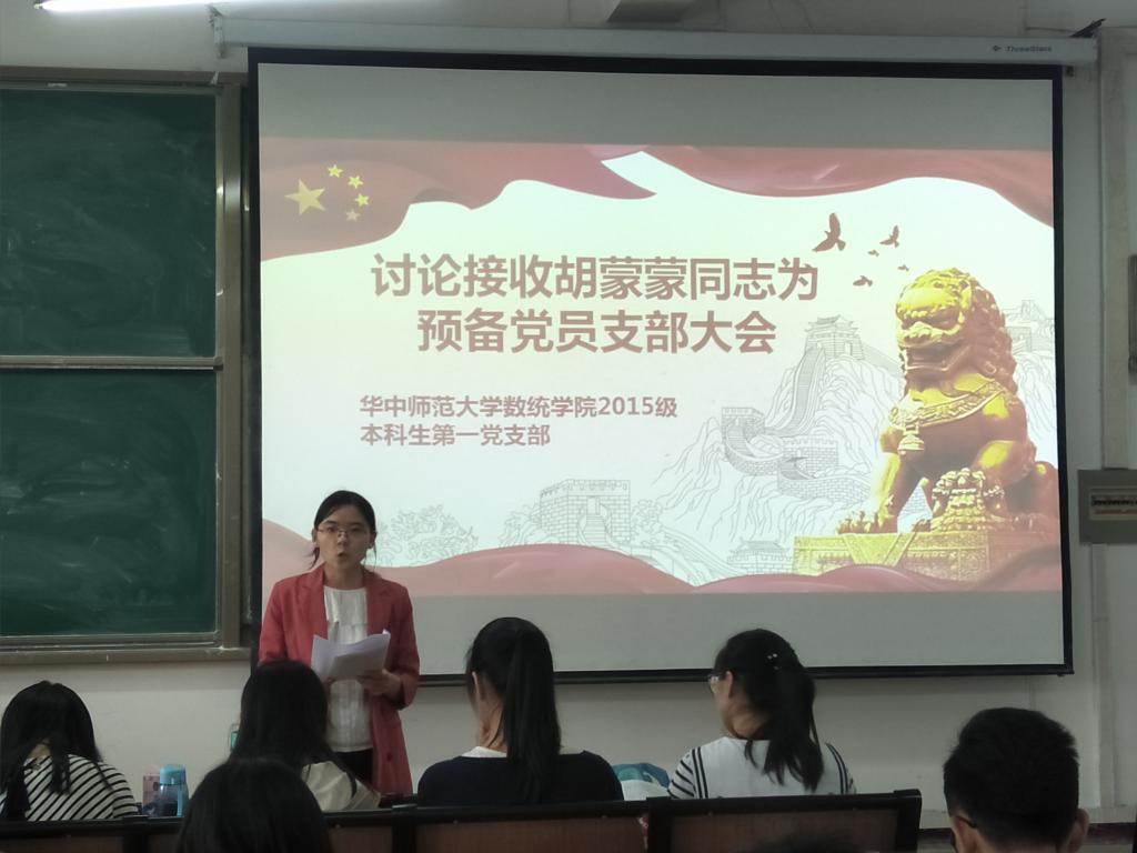 会议由王晴同志主持,第一项为接受新的预备党员。根据发展党员流程,首先由发展对象叙述自己的实际情况,再由党支部纪律组成员宣读审查报告,紧接着培养联系人和党员对该名发展对象发表意见,最后,全体党员进行无记名投票表决。在紧张严肃的气氛中,所有发展对象均获得全票通过,被接收成为2015级本科生党支部的预备党员,之后新接收党员分别进行表态,表达自己为实现共产主义奋斗终身的理想信念。