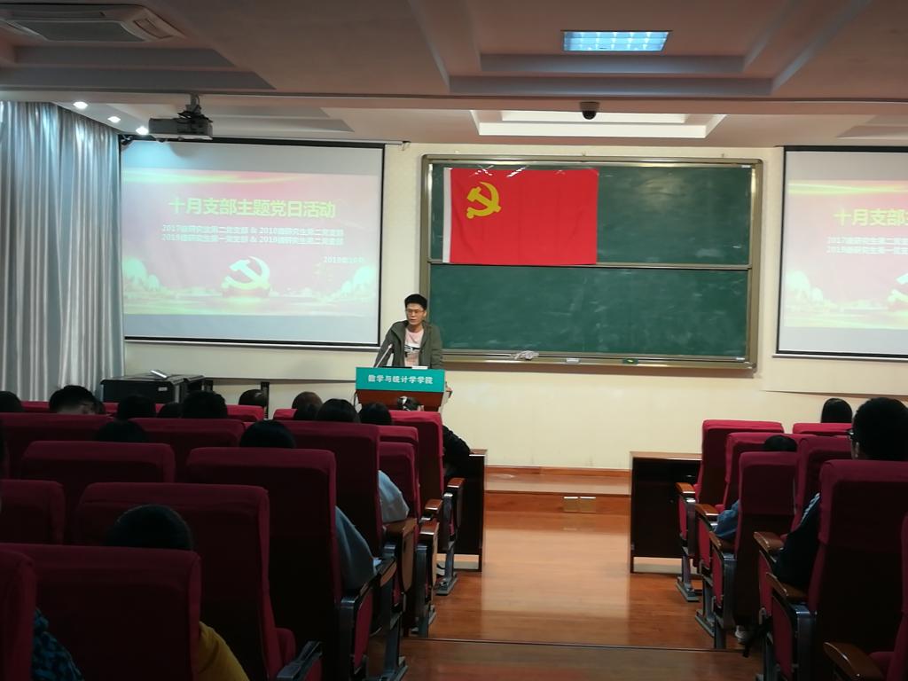 10月11日,我院2017级研究生第二党支部、2018级研究生第二党支部、2019级研究生第一党支部和第二党支部于六号楼二楼报告厅开展了十月支部主题党日活动。本次活动主题为“不忘初心,牢记使命”。本次活动由2017级研究生第二党支部支部书记覃启冲主持召开。