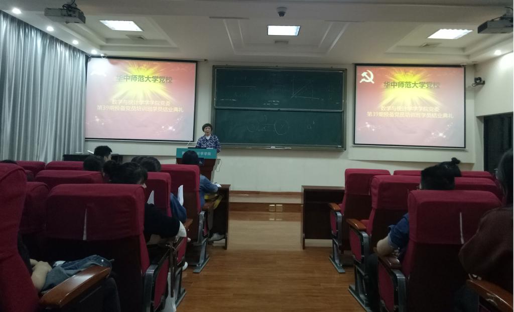 (通讯员 蒋慧敏)10月12日晚18:30,华中师范大学数学与统计学学院党委第39期预备党员培训班学员结业典礼在六号楼6401顺利开展。此次典礼由研究生党支部成员李坤丽同志主持,预备党员培训班数学与统计学学院带队老师余世桂出席本次典礼。