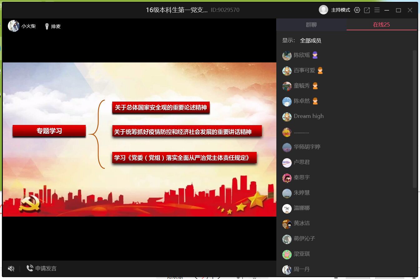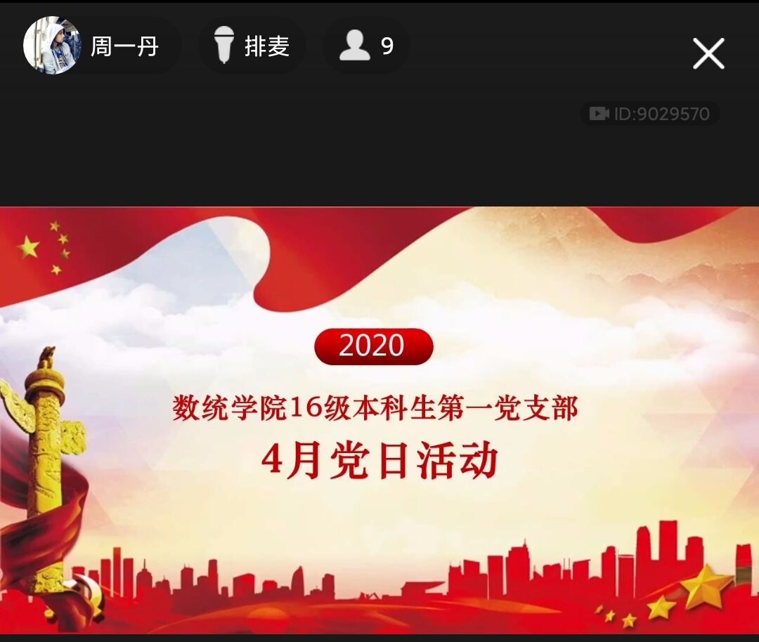 2020年4月24日晚,华中师范大学数统学院2016级本科生第一党支部利用群课堂线上组织开展了本支部4月主题党日活动,本次活动由支部书记陈欣瑶组织,主要学习内容为深入学习贯彻习近平总书记关于总体国家安全观的重要论述精神、学习贯彻习近平总书记关于统筹抓好疫情防控和经济社会发展的重要讲话精神以及学习贯彻中共中央办公厅印发的《党委(党组)落实全面从严治党主体责任规定》。
