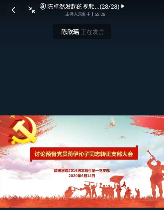 2020年6月13日,我院2016级本科生第一党支部召开了关于讨论预备党员陈亦可等14名同志的转正大会。因疫情原因,本次会议采取钉钉会议的线上方式召开。本次大会到会成员为支部的14名正式党员、14名预备党员,本次会议由党支部书记陈欣瑶同志主持召开。
