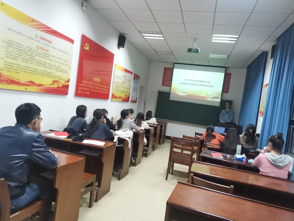 在重温入党誓词、诵读党章、缴纳党费过后,支部党员匡文彬同志以短视频与PPT相结合的方式,带领全体与会党员学习习近平总书记在抗美援朝70周年大会上的讲话,讲话主要概括为:怀念老一辈革命家、问候健在将士及家属烈属、怀念烈士们、感谢朝鲜军民、介绍抗美援朝的背景、总结抗美援朝胜利的意义、强调抗美援朝精神、铭记伟大时刻推进伟大事业。匡文彬强调抗美援朝的时代背景以及我国参与战争的正义性、艰难性。紧接着,大家又一起学习贯彻十九届五中全会精神,匡文彬强调会议的主要议程以及重要性。最后,匡文彬同志带领大家学习《深化新时代教育评价改革总体方案》,并强调《总体方案》通篇渗透着教育价值观的立场、尺度,反映了教育事业发展的价值追求,为弘扬新时代教育价值观提供了机制、行为、思想和环境保障。