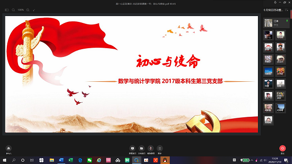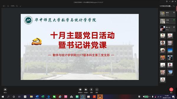 (通讯员 冯敦悦)11月10日中午,数学与统计学学院2017级本科生第三党支部通过企业微信开展十月主题党日暨书记讲党课活动。本次活动由组织委员江淋同志主持,依次进行10月党日活动、书记讲党课及民主议事三个环节。