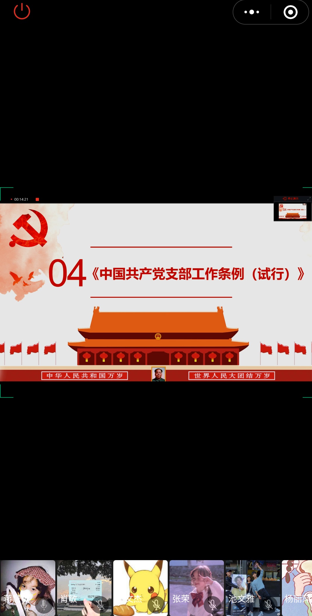 会议伊始,支部成员在蒋慧敏同志的带领下,重温入党誓词,由文舟舟同志为全体成员诵读党章。其后,程嵘同志安排缴纳党费的相关事宜。