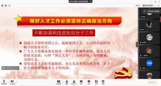 紧接着,黄思雨同志做主题为“深入实施新时代人才强国战略,加快建设世界重要人才中心和创新高地”的学习分享,讲述了对习近平总书记在中央工作人大会议上的重要讲话精神的理解感悟。