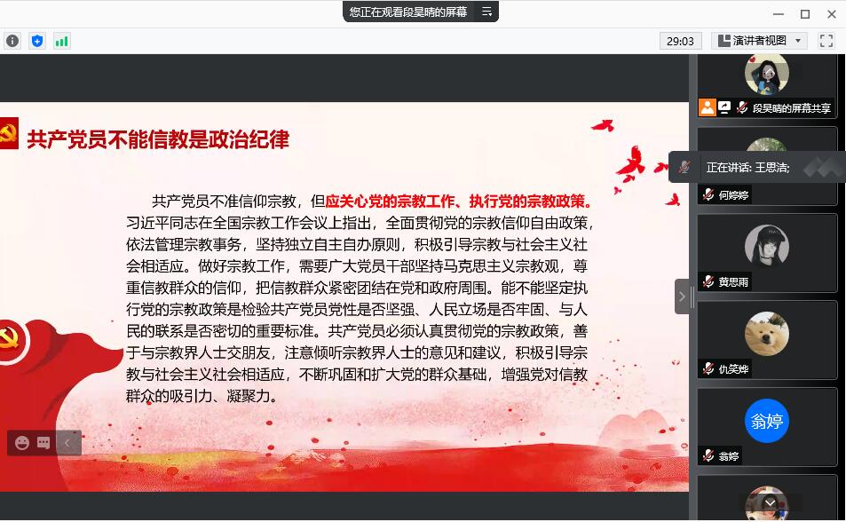然后,开展党员不信教专题教育,由曾妍雯同志讲解习近平总书记在2021年宗教会议上的讲话精神,指出共产党员不准信仰宗教,这是我们党的政治纪律,是我们党区别于大多数政党的一大特点。据此,王思洁同志介绍了《中国共产党纪律处分条例》第五十九条——六十四条相关内容。曹袁飞同志分享学习心得,他认为公民有信仰宗教的自由,但是共产党员不能信仰宗教,不能参加宗教活动,这是由党的性质和共产党员的世界观决定的。共产党员信仰宗教,参加宗教活动,违背党的性质,削弱党组织的战斗力,降低党在群众中的威信,也不利于正确贯彻执行党的各项路线方针政策。