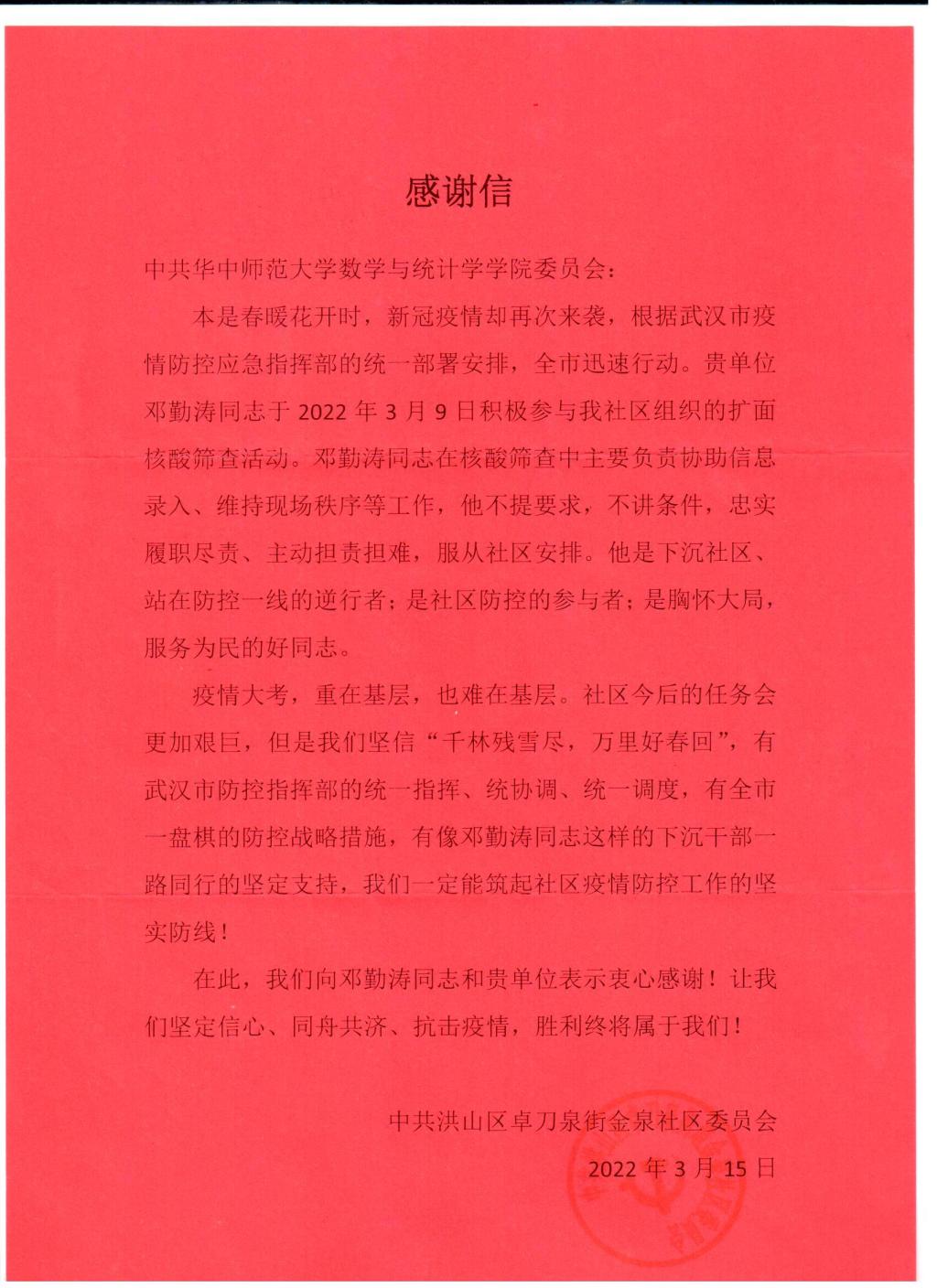 近日,湖北省武汉市中共洪山区卓刀泉街金泉社区委员会发来感谢信,对我院代数与几何党支部邓勤涛同志在金泉社区扩面核酸检测筛查活动中的积极响应和支援表示感谢。