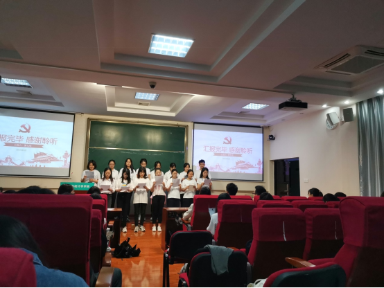 第四小组、第五小组主题为如何正确认识党史、新中国史、改革开放史、社会主义发展史,并牢固树立“胸怀报国志,永远跟党走”的坚定信念?第四小组首先讲解了我们应树立爱国意识;其次给我们带来《黄河颂》中第八章第二篇的诗朗诵,并给我们讲解了《黄河颂》的创作背景;最后在第四小组组员许婧扬的小提琴的伴奏下,合唱了歌曲《我的祖国》。第五小组也讲到了爱国主义,并带我们回顾了抗美援朝战争的背景与意义,最后带给大家诗朗诵《抗美援朝》。