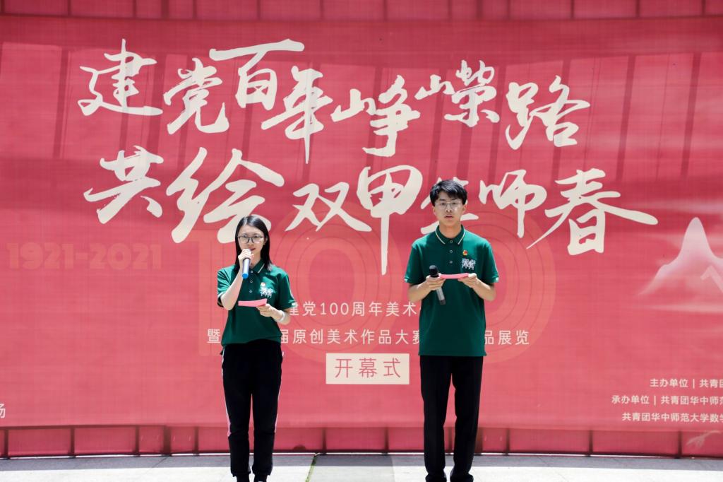 (通讯员 詹翔雯 郑紫晗)5月24日中午,华中师范大学庆祝建党100周年暨第十二届原创美术作品大赛优秀作品展览开幕式在喷泉广场隆重举行。此次展览是第三十四届“树人杯”艺术文化节系列活动之一,由共青团华中师范大学委员会主办,共青团华中师范大学美术学院委员会与数学与统计学学院委员会联合承办。校团委书记麻旎、校团委副书记胡余映、美术学院党委副书记李宪玲、数学与统计学学院党委副书记田俊及部分学院团委书记作为嘉宾出席开幕式现场。