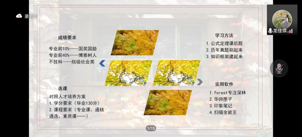最后一位分享者2019级本科生龙佳琪则着重在综测加分和多维发展两个方面向大家分享自己的经验。在综测加分方面,她建议大家积极参加各种比赛,这不仅可以提升自己的师范生能力,还可以认识很多新的朋友,扩大自己的交际圈,同时参加这些比赛对于自己综合素质的提升也有所帮助。从多维发展方面,她提到大学生目前的压力比较大,可以通过户外运动如跑步,打羽毛球等自己感兴趣的活动来放松心情,她还鼓励大家参加自己喜欢的社团。最后,她用“到等风来,不如追风去”来鼓励大家,希望大家尽自己最大的可能去努力。