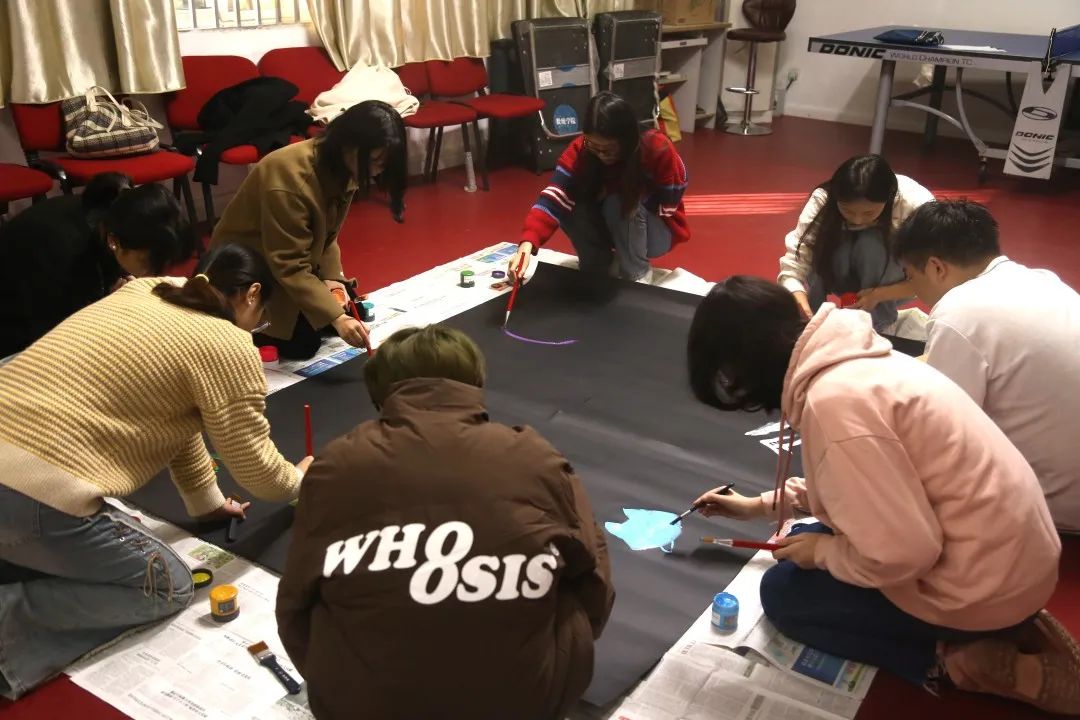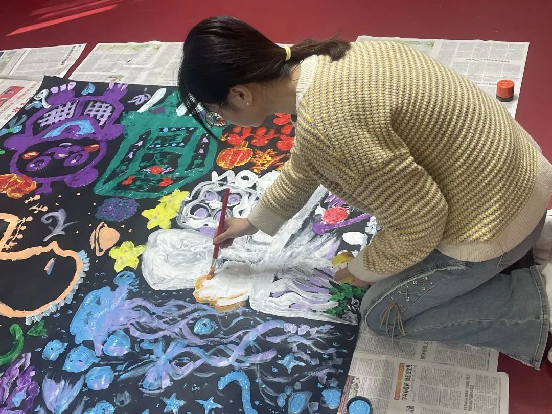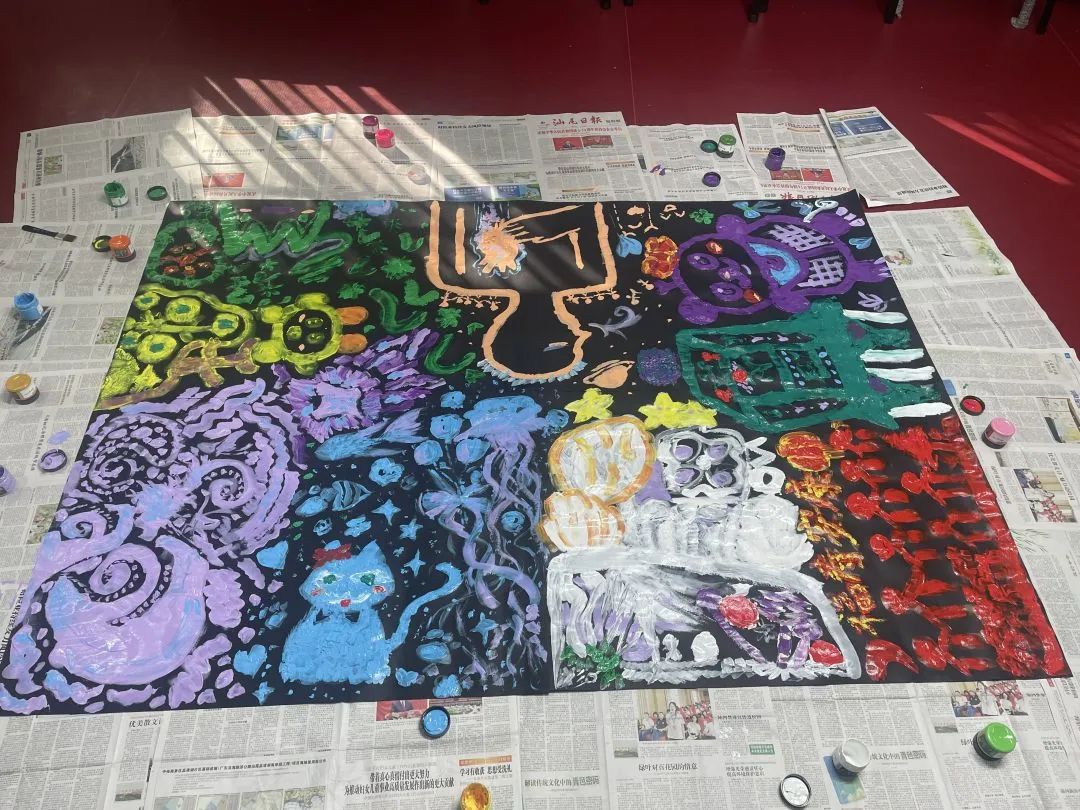 刚开始绘画时,同学们都在自己的绘画区域内单独作画,在老师的动员与互动下,同学们逐渐“破冰”,帮助其他同学进行创作和修饰。
