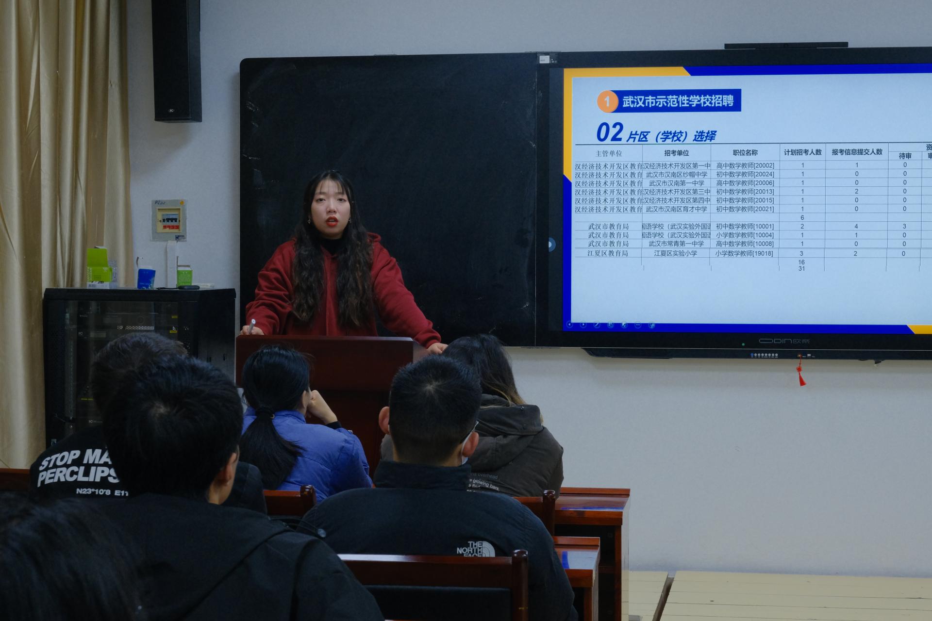 会上,丁楚结合自身备考经历从打好信息差、提高执行力、提前做规划和打好持久战四个方面进行分享,并着重分析了在招聘中提前做好准备的重要性和必要性。丁楚就即将到来的武汉市示范性招聘围绕报名方式、学校选择、考核方式和后续工作四个板块做出详细说明和讲解,并对考核中结构化面试、无生试讲的注意事项和考前准备工作进行分析和建议。