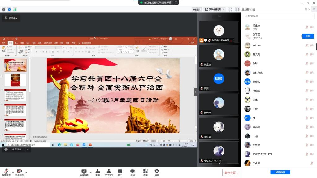 (通讯员 张平煜)3月18日下午,为宣传学习共青团十八届六中全会精神,推进团支部建设,增强团员的责任意识,数学与统计学学院(以下简称“数统学院”)2102团支部于线上开展了三月份主题团日活动。活动分为三部分:共同学习共青团十八届六中全会精神、共青团知识问答和总结发言。2102全体团支部成员参加本次活动。
