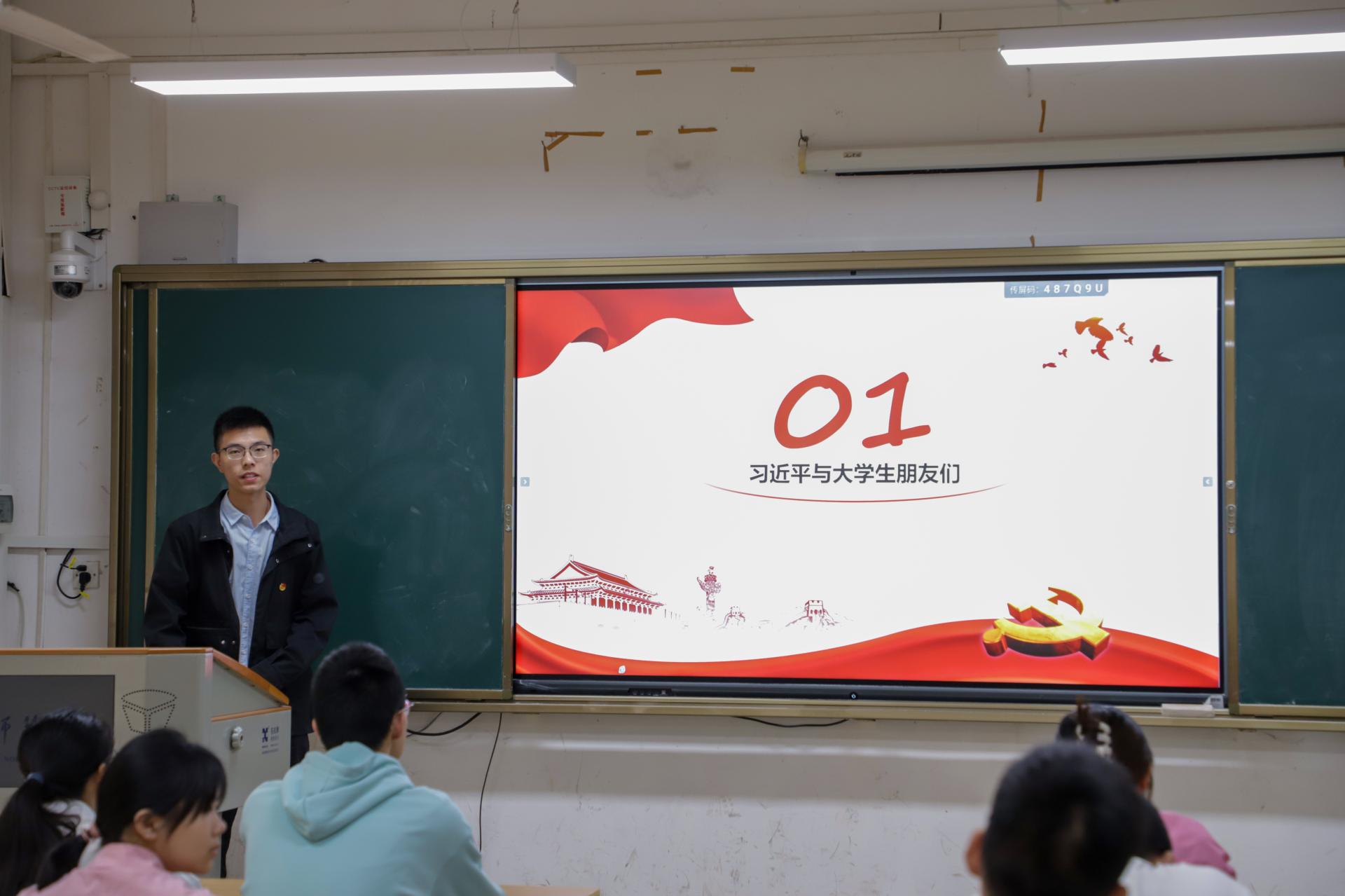 “在阅读习近平总书记对青年学生的殷切嘱托后,我深刻体会到青年学生应该从小事做起、善小而为、日积月累”。何晨向在场同学分享阅读《习近平与大学生朋友们》的感悟,要脚踏实地增强自己的实干本领,并在实践中深入学习、启发思考、不断创新。向汉阳以知识问答形式,巩固同学们在此次主题团日的学习成果。
