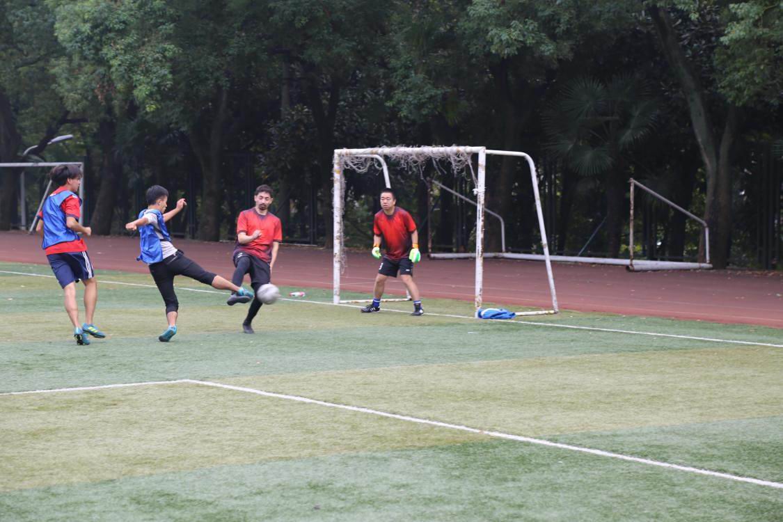 随着裁判员一声哨响,比赛正式开始。上半场伊始,双方都是试探性进攻,采取保守战术。终于,在比赛进行至5分钟时,教职工队球员回球给门将时速度稍慢,新生队左前锋抓住机会,面对门将强硬斜射,先进一球。新生队取得开门红,士气大涨。教职工队也没有气馁,积极调整,开始加快比赛节奏,连续造成威胁性射门,在两次角球时刻,精准传球,头球垫上。虽然第一次射门被新生队门将挡住,但在二次进攻时,新生队门将一不留神失守了,教职工队连中两球,乘胜追击,将比分反超。在上半场的结束之际,又再接再厉,乘胜追击,教职工队再添一球。上半场以教师队3:1的优势告终。