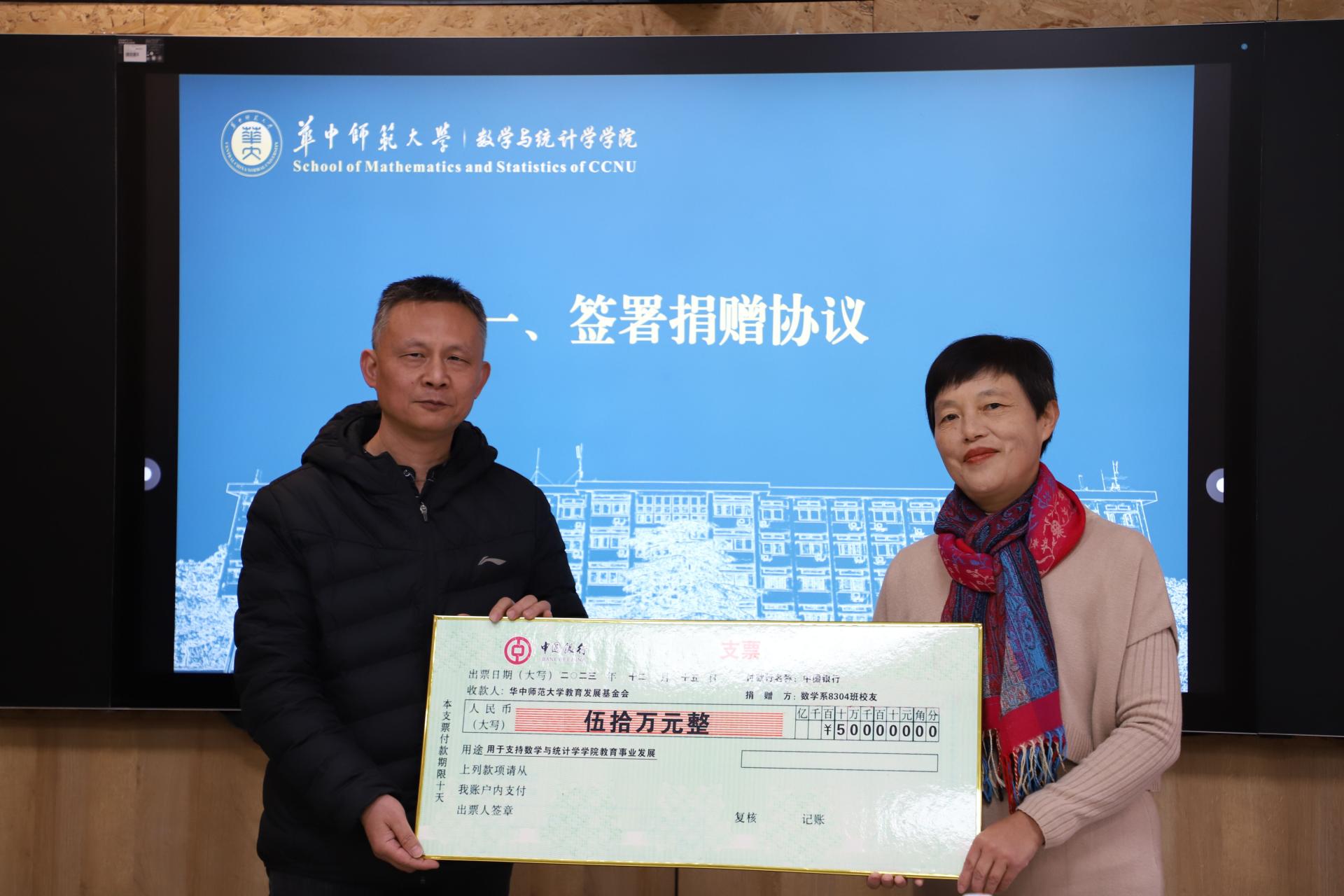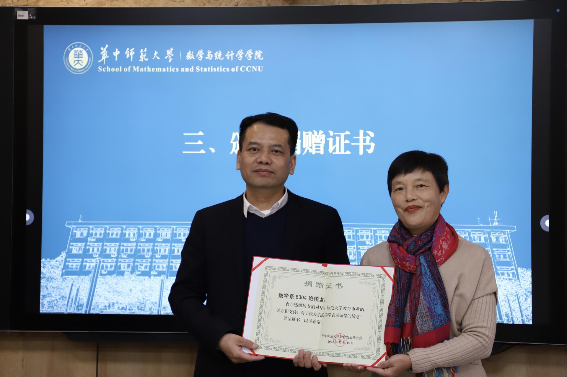 捐赠仪式上,数学系8304班校友向学院捐赠50万元,用于支持学院教育事业发展。华中师范大学教育发展基金会秘书长郭庆与数学系8304班校友代表、广州市85中学教师、广州市优秀教师唐庆华签署了捐赠协议,数统学院副院长左国新接收捐赠支票,刘继文代表学校为8304班校友代表唐庆华颁发捐赠证书、捐赠奖牌。数统学院党委书记刘成竹为8304班校友代表唐庆华赠送学院纪念品《桂子记忆》。
