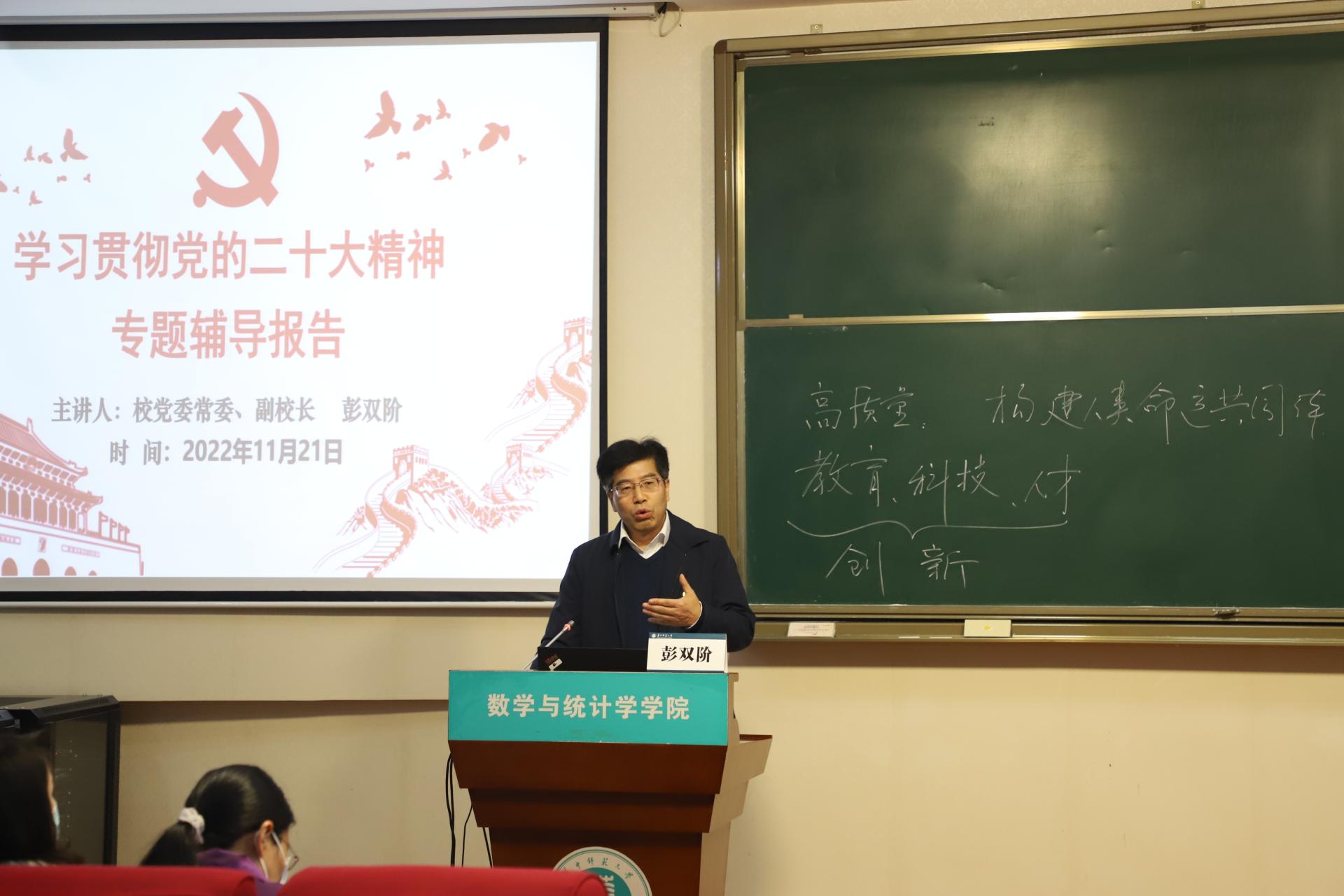 11月21日下午,校党委常委、副校长彭双阶教授为数学与统计学学院(以下简称:数统学院)师生作学习贯彻党的二十大精神专题辅导报告。数统学院党委委员、教工党支部书记代表列席此次报告会,数统学院部分研究生党员代表及本科生卓越人才班入党积极分子到场学习。此次报告会由院党委书记刘成竹主持。