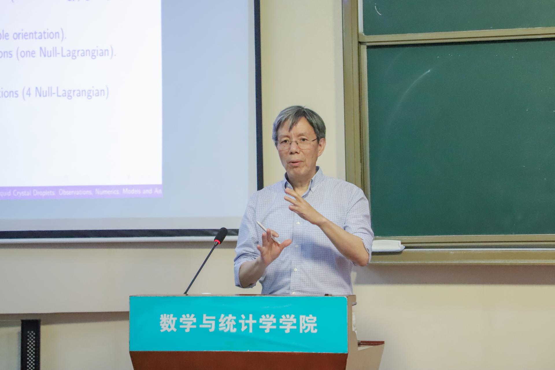 在交流中,林芳华教授以Liquid Crystal Droplets: Observations, Numerics, Models and Analysis为题做专题报告。他从液晶理论中几类重要的数学模型出发,简要介绍上述模型的相关研究背景,给出近三十年来相关模型的研究进展,并提出多个重要的公开问题。在互动环节,师生们围绕前沿问题与林芳华教授展开交流。