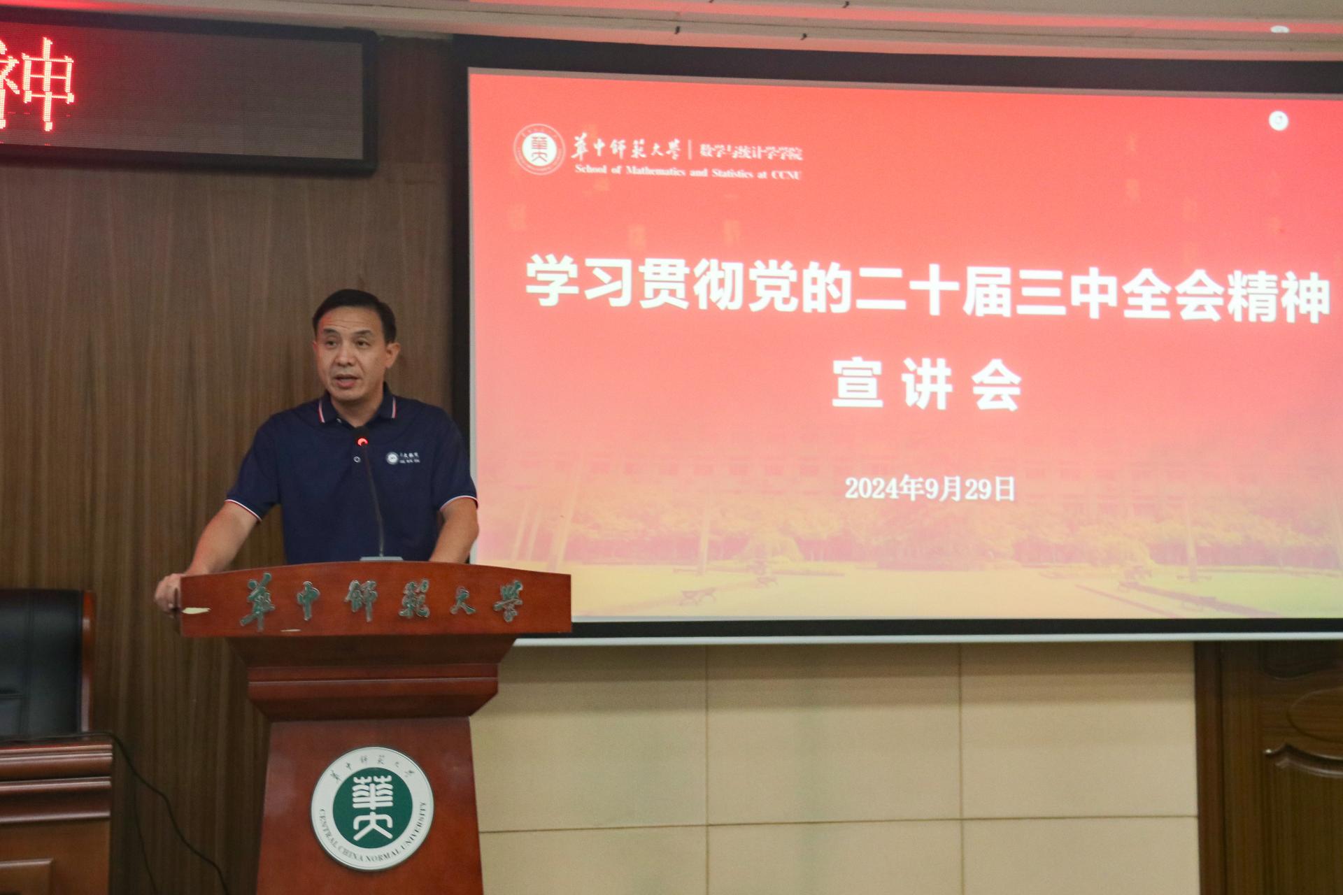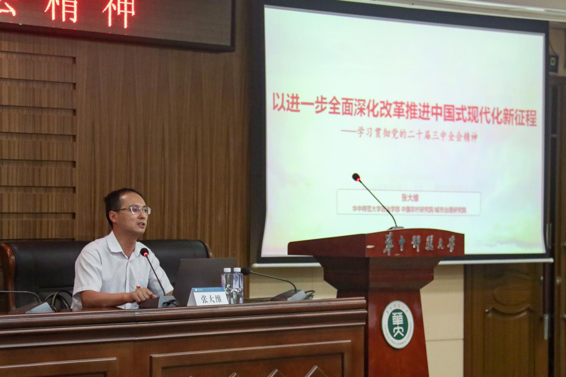 (通讯员 马一萌)9月29日下午,数学与统计学学院(以下简称“数统学院”)学习贯彻党的二十届三中全会精神宣讲会在逸夫国际会议中心一楼报告厅举行,武汉市委宣讲团成员、华中师范大学中国农村研究院教授张大维以《以进一步全面深化改革推进中国式现代化新征程——学习贯彻党的二十届三中全会精神》为题作了专题辅导报告。学院全体教职工参加会议,宣讲会由数统学院党委书记刘成竹主持。
