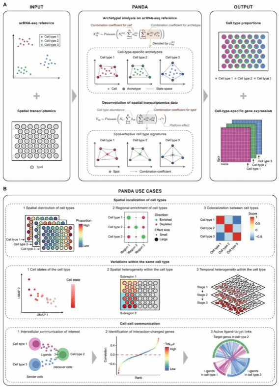 该研究提出了一种创新的空间转录组数据反卷积方法PANDA,可同时推断测量位点的细胞类型比例和细胞类型特异性基因表达,用计算方法克服了当前空间转录组技术分辨率低的局限,并成功解读了大脑、肿瘤、心脏等复杂组织的空间异质性。张晓飞教授和陈洛南研究员为该论文的共同通讯作者,2021级博士研究生王蒙国为第一作者,华中师范大学为该项研究的第一完成单位。