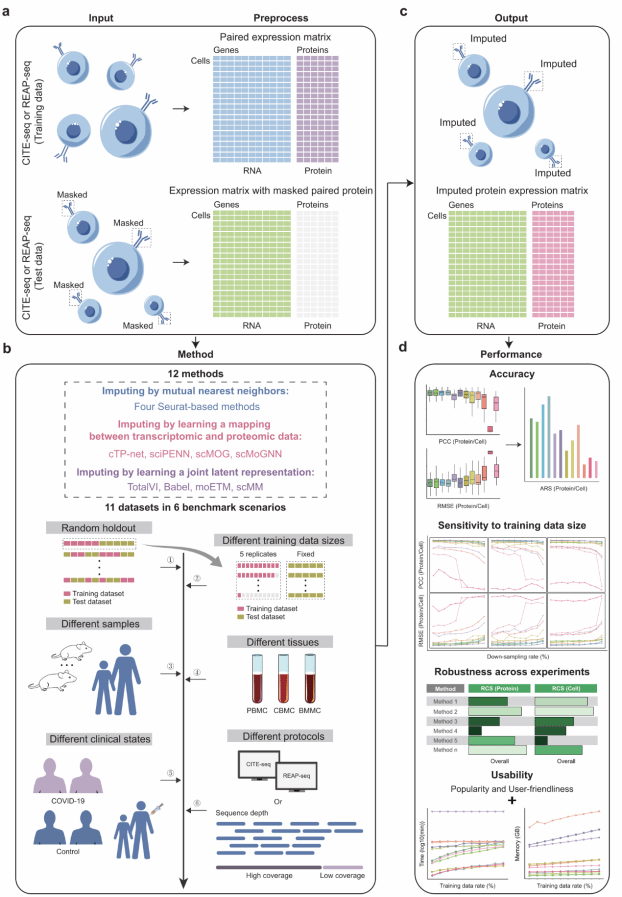 研究团队在《Genome Biology》期刊发表题为“Benchmarking single-cell cross-omics imputation methods for surface protein expression”的研究论文,创新性地建立了单细胞缺失组学数据填补算法评估新范式,为生物医学研究者提供了可靠的算法选择依据,为新型多模态数据整合与填补方法的开发提供了重要的理论基础和技术支撑。张晓飞教授为该论文的通讯作者,与李波教授共同指导,2022级博士研究生李晨阳和2022级硕士研究生洪永佳为共同第一作者,华中师范大学为该项研究的独立完成单位。