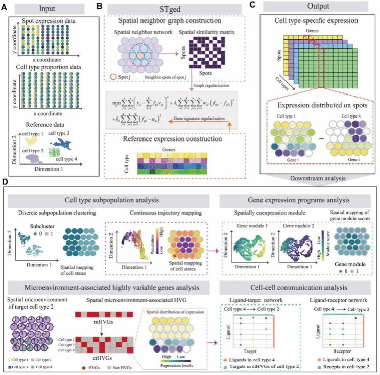 该研究提出了另一种创新的空间转录组基因表达反卷积方法STged,用于解析单个测量位点中细胞类型特异性的基因表达,并成功应用于人类肿瘤和小鼠肾脏的组织结构解析。张晓飞教授和林志翔教授为该论文的共同通讯作者,论文第一作者是涂佳娟博士(课题组2021年毕业博士生,现为湖北工业大学副教授)。