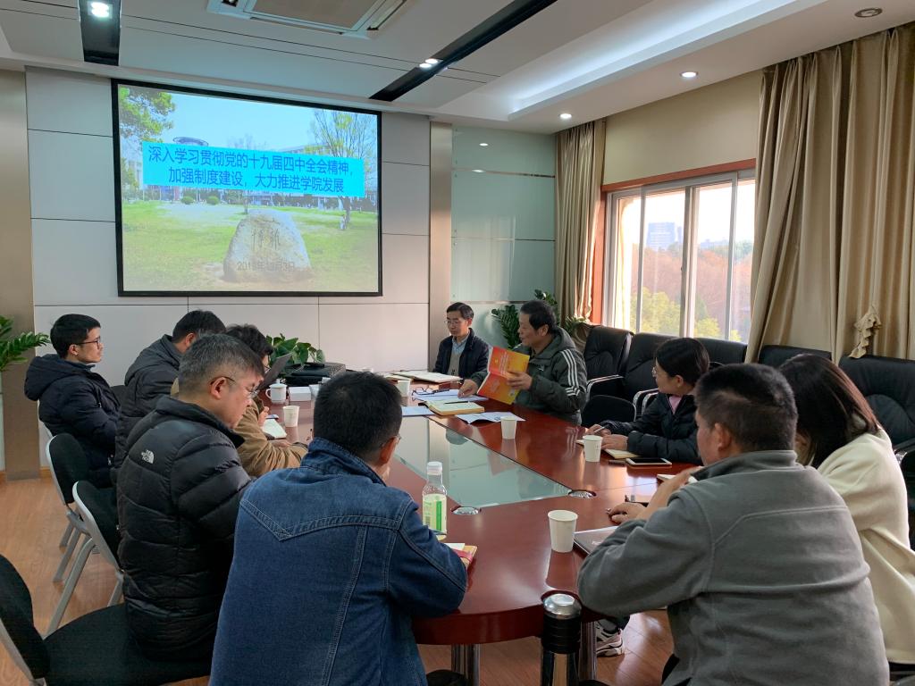 12月3日下午,数学与统计学学院党委中心组于六号楼四楼会议室开展了关于“党的十九届四中全会精神”理论宣讲活动。我院党委委员、中心组成员、教师和学生党支部书记代表参加了此次会议,会议由党委书记王中主持并进行理论宣讲。