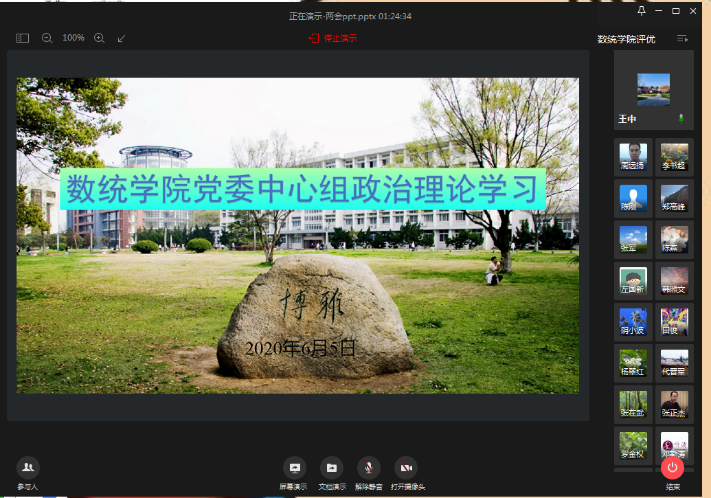 6月5日下午,学院党委中心组利用企业微信平台开展了5月份集中理论学习,此次学习的主要内容为2020年全国“两会”会议精神。会议由学院党委书记王中主持,学院党委委员、各教工党支部书记、系主任、教研室主任、办公室主任、工会主席等参与了此次会议。