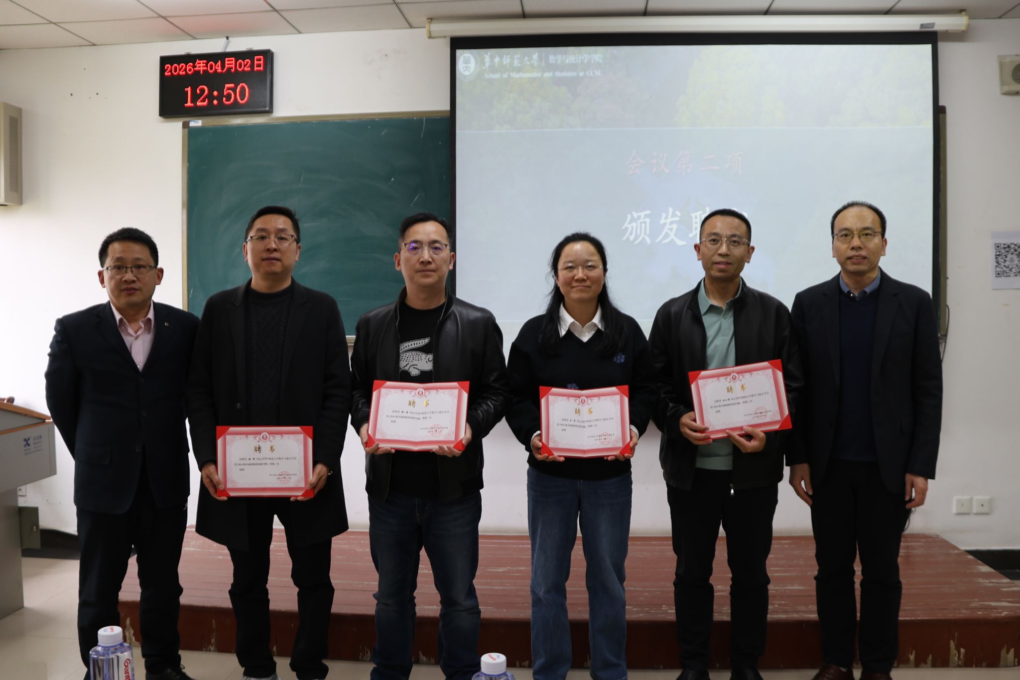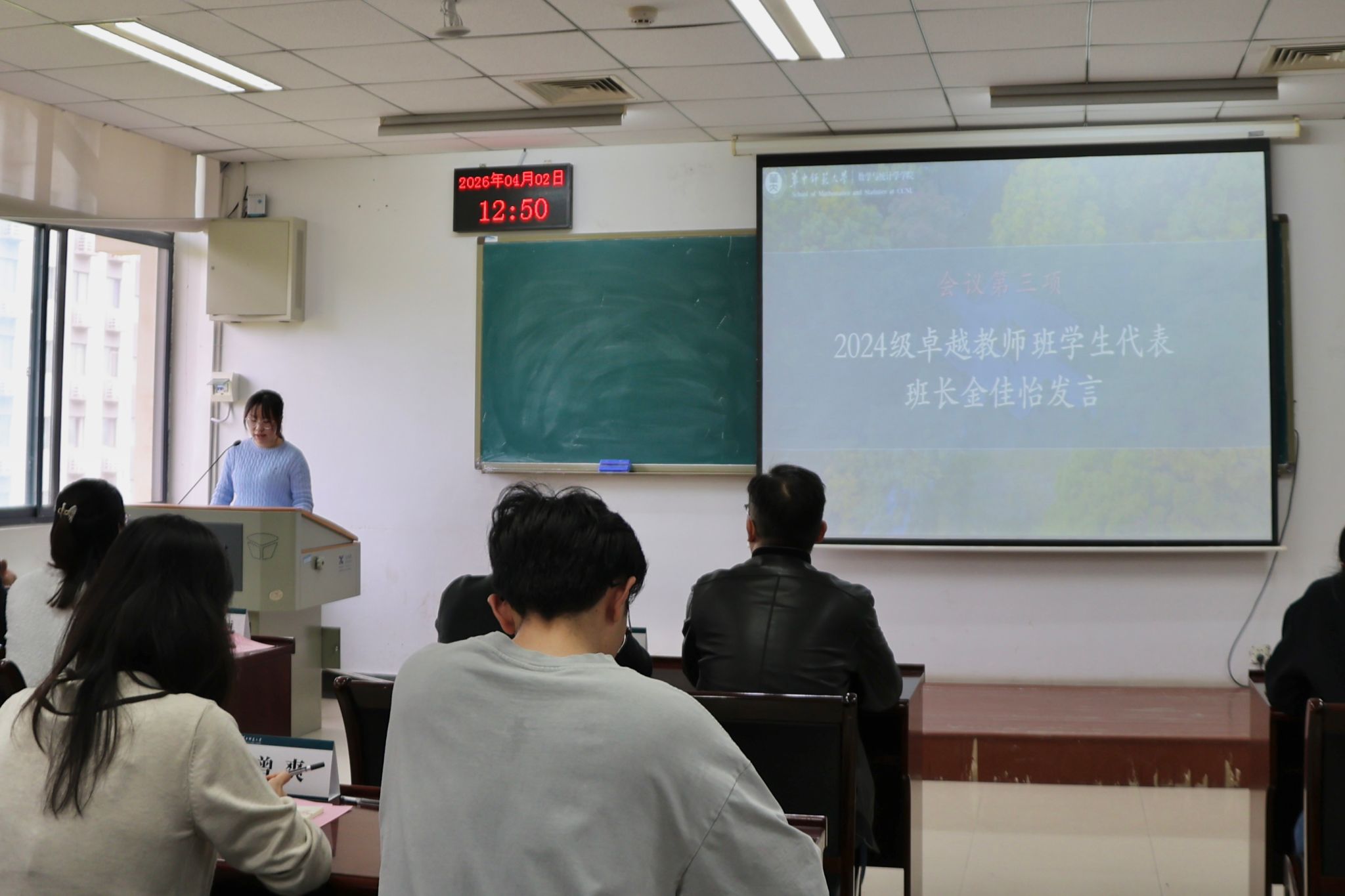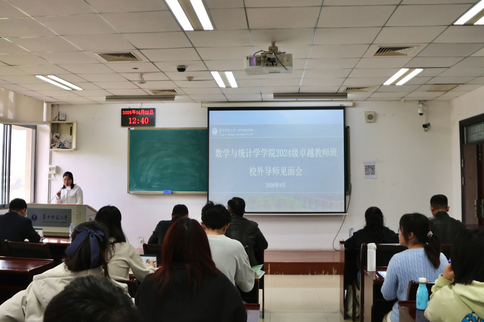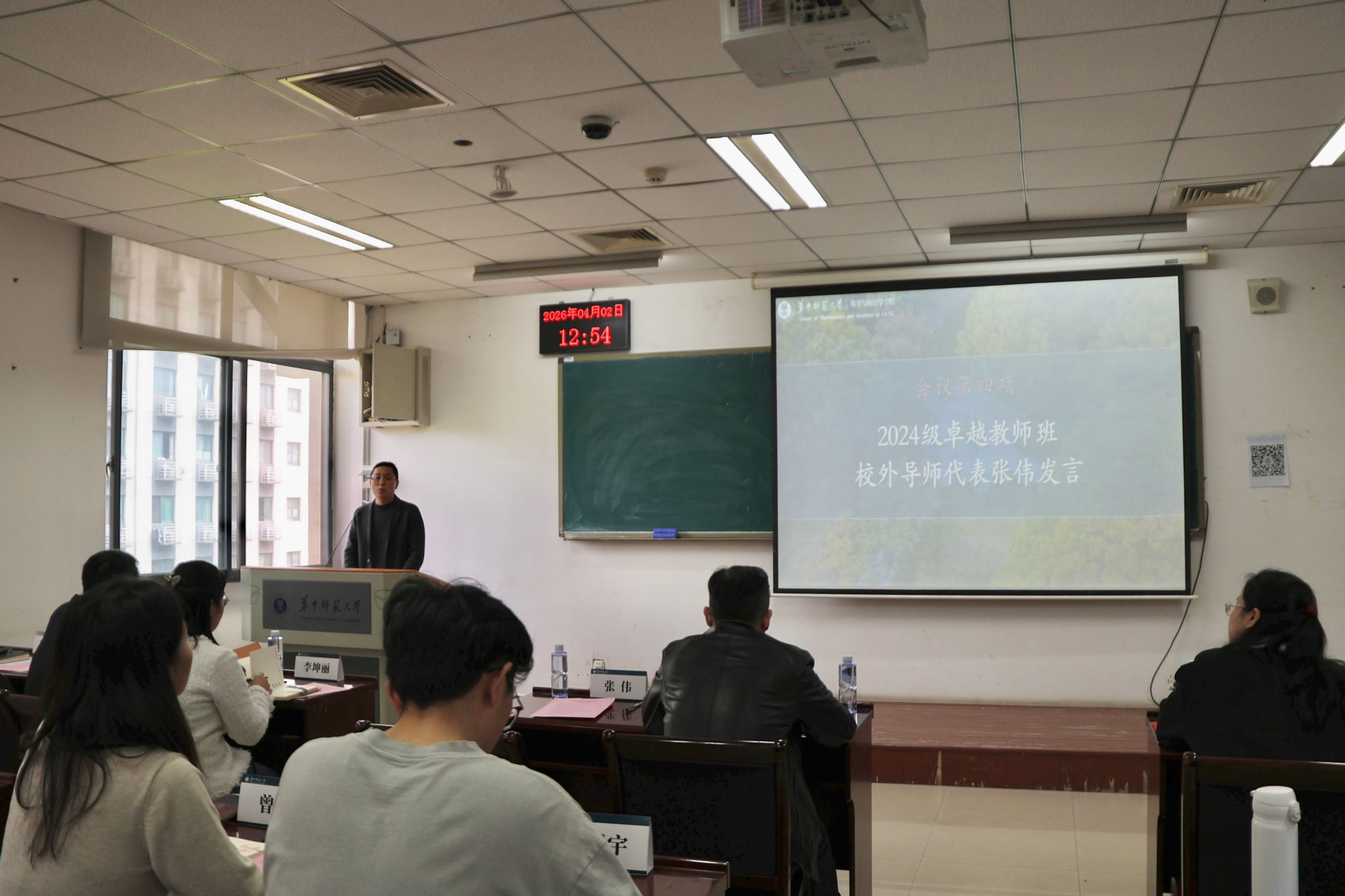 4月2日,数学与统计学学院(以下简称“数统学院”)2024级卓越教师班校外导师见面会在国交三号楼C508教室顺利举行。湖北省教育科学研究院中学数学教研员张伟、湖北省楚天名师徐涛、湖北五一劳动奖章获得者吴倩、武汉外国语学校文创班班主任刘小博等校外导师代表,数统学院党委副书记杨可军、副院长李波,2024级卓越教师班班主任李坤丽,2024级辅导员曾爽、王新宇及2024级卓越教师班全体学生出席本次见面会。会议由李坤丽主持。
